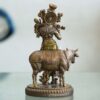 This bronze statue depicts the Hindu god Krishna playing his flute alongside a cow. Krishna is a popular deity in Hinduism, known for his love, compassion, and playfulness. The cow is considered a sacred animal in Hinduism and symbolizes purity, innocence, and abundance. This statue is a beautiful and meaningful representation of Krishna’s divine love and connection to all living beings.